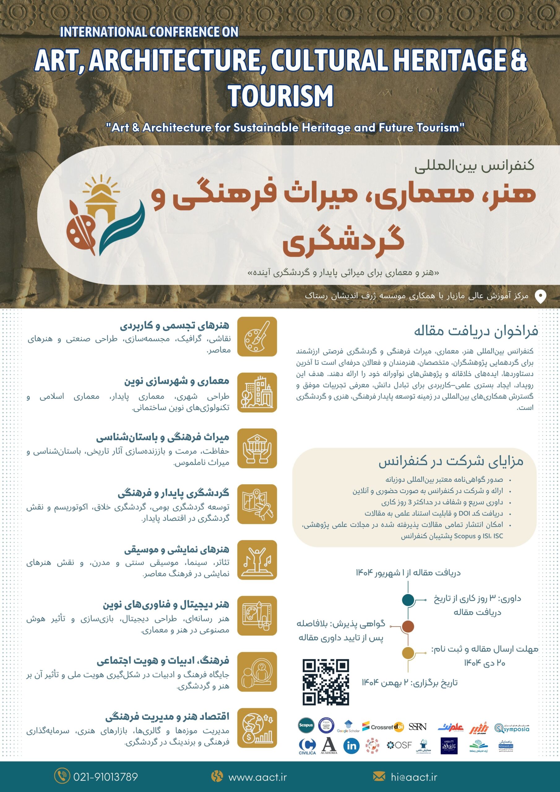 کنفرانس بین المللی هنر، معماری، میراث فرهنگی و گردشگری (International Conference on Art, Architecture, Cultural Heritage & Tourism) یک رویداد علمی جامع است که با هدف پیوند دادن پژوهش های بین رشته ای در حوزه های هنرهای تجسمی و کاربردی، معماری و شهرسازی، میراث فرهنگی و باستان شناسی و نیز گردشگری پایدار برگزار می شود. این همایش به پژوهشگران، دانشجویان، هنرمندان، مدیران فرهنگی و فعالان صنعت گردشگری فرصت می دهد دستاوردهای علمی و عملی خود را در محیطی تخصصی ارائه کنند و برای حل مسائل واقعی شهرها، موزه ها، بناهای تاریخی و مقصدهای گردشگری راهکارهای نو ارائه دهند.